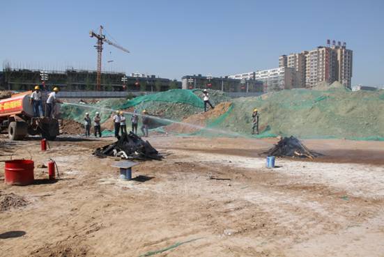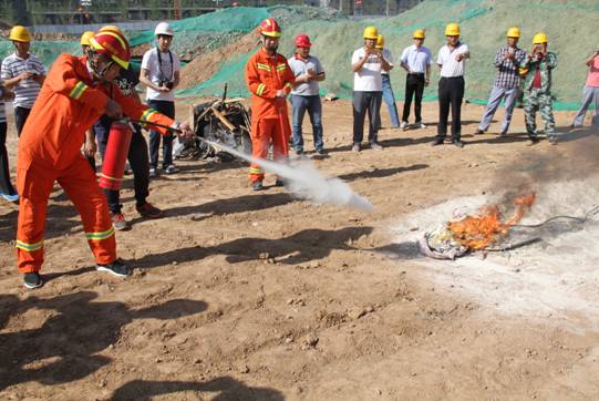 現(xiàn)場分別進行了模擬電線著火、油料起火、墻面防護網(wǎng)起火、材料庫起火等火災險情,分別采用干粉滅火器、消防沙、混合水、蓋板覆蓋、自備消防車等滅火方式。針對不同火險由專職安全員現(xiàn)場講解不同滅火器材的適用范圍、使用方法、操作要領、滅火部位。隨后現(xiàn)場進行了各種模擬火險的滅火演練。利用現(xiàn)場條件,總工程師王振福為大家詳細講解了灰土擠密樁施工工藝及設備介紹,公司員工根據(jù)現(xiàn)場施工條件詳細了解了基礎施工工藝及現(xiàn)場管理,開闊了大家的眼界,增長了見識,學習了施工管理經(jīng)驗。